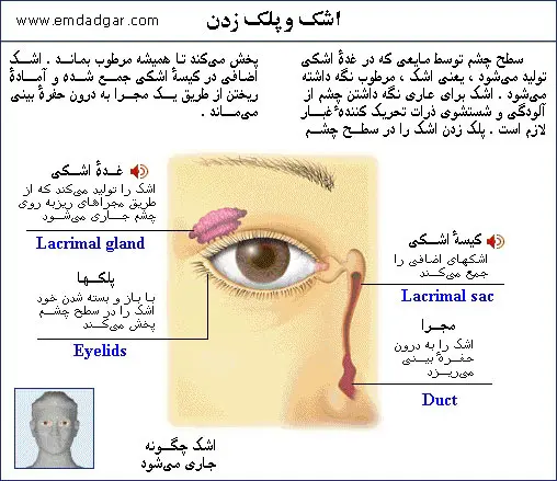 اشک از یک غده که در زیر پلک فوقانی، در قسمت خارجی واقع شده است ترشح شده و بر سطح چشم پخش می شود. این غده اصلی ترشح اشک است که معمولآ در موقع تحریک و یا گریه ایجاد ترشح اشک می کند. علاوه بر این، غدد متعدد کوچکی در سطح ملتهمه وجود دارند که در حالت عادی اشک ترشح می کنند.